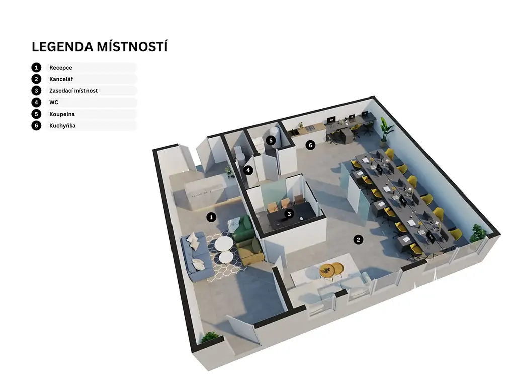 V přízemí se nachází otevřený prostor o celkové ploše 120 m², který prošel kompletní rekonstrukcí a nabízí moderní zázemí pro office point nebo medical centre, prodejnu, salon, či cokoliv jiného. Včetně samostatného WC a technické místnosti s kuchyňkou (přiložené fotografie "office point" jsou pouze vizualizace a slouží pro lepší představivost k využití prostoru).