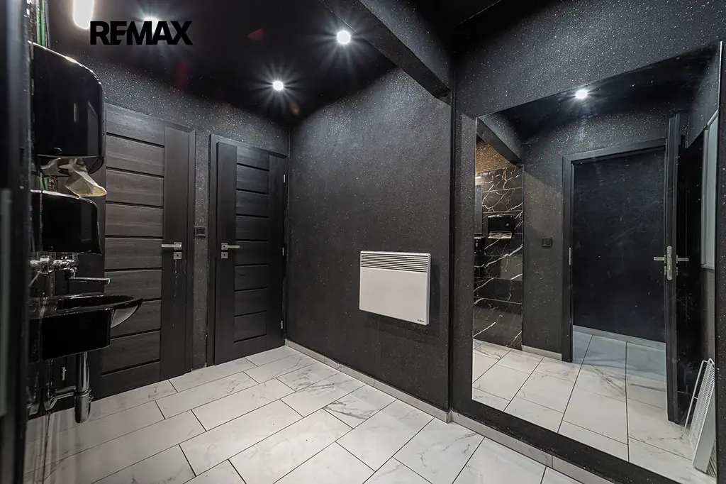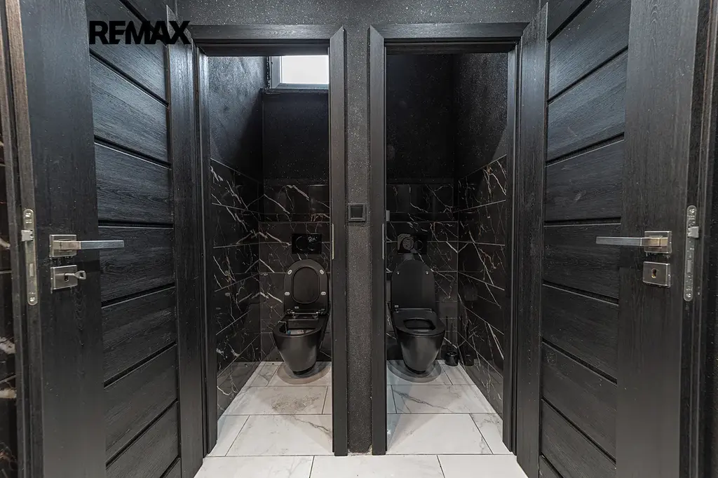 Prostor v 1. NP obsahuje technické a hygienické zázemí, toalety a kancelář. Vše v krásném designovém stylu.