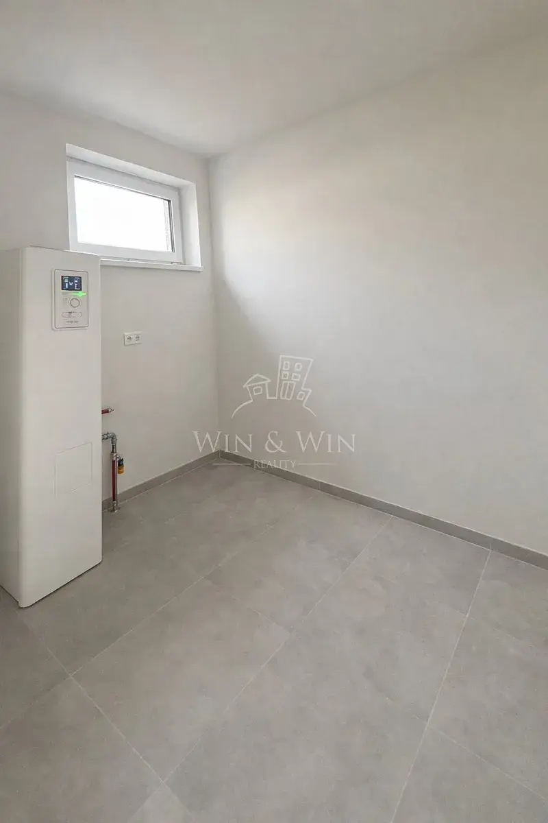 Samozřejmostí je podlahové vytápění s individuální regulací v každé místnosti, tepelné čerpadlo NIBE, kvalitní trojskla a celkově nadstandardní technologické řešení zajišťující nízké provozní náklady a příjemné klima po celý rok. Na podlahách je použit kvalitní vinyl, který podtrhuje moderní vzhled interiéru a zároveň je praktický na údržbu. V obývacím pokoji jsou instalovány designové LED pásky, které vytvářejí příjemnou atmosféru.