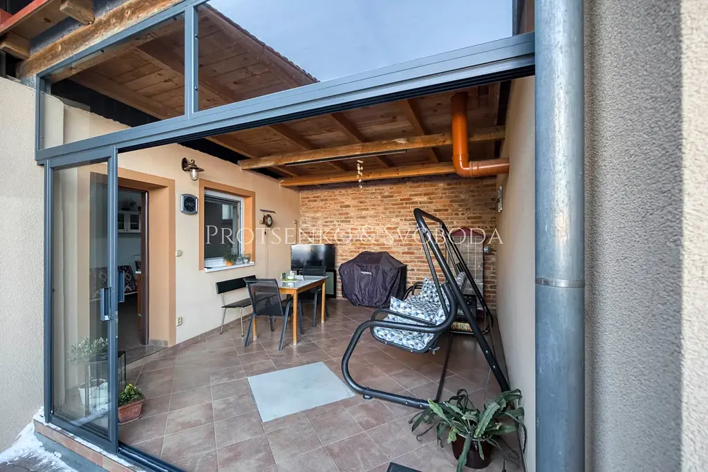 Velkým benefitem domu je venkovní terasa s možností uzavření prosklenými dveřmi, díky čemuž vzniká útulný prostor vhodný nejen na léto. Terasa navazuje na venkovní kuchyni, kde po zatopení vytvoříte příjemné zázemí pro rodinné večeře a posezení s přáteli po celý rok – včetně zimy.