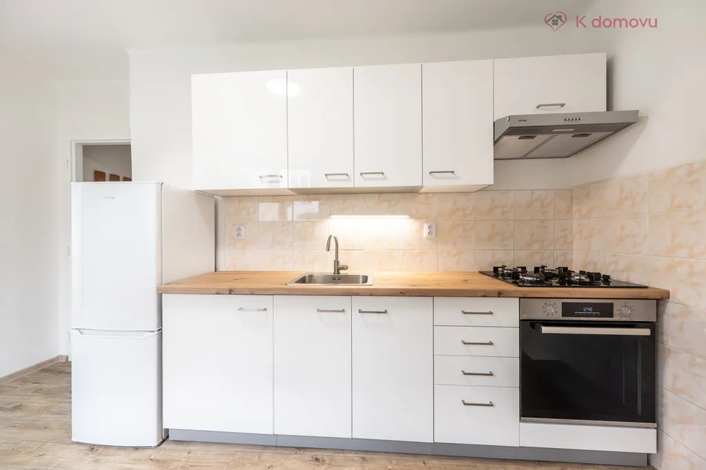 Kuchyň je nově vybavená kuchyňskou linkou s veškerými spotřebiči jako je lednice, trouba, plynová varná deska. Z kuchyně je vstup do obývacího pokoje.