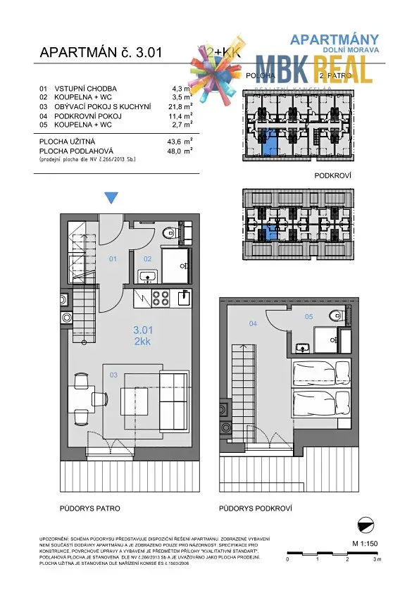 Dispozice: 2+kk - mezonetový apartmán o vel. 48 m2 se nachází v 2. a 3. patře apartmánového domu s dvěma koupelnami s WC, které jsou nadstandardně umístěné v každém patře.