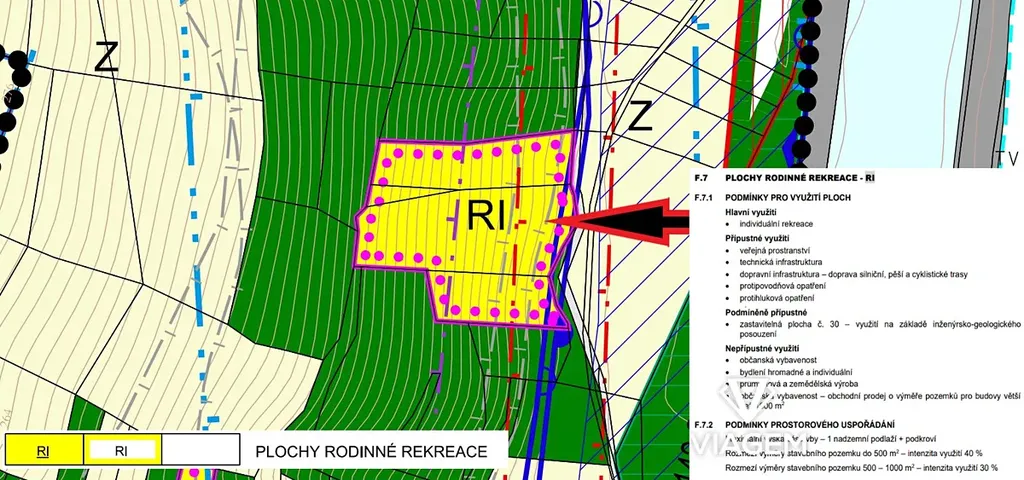Pozemek je v územním plánu veden jako plocha pro rodinnou rekreaci. Vzhledem k jeho charakteru a ochrannému pásmu VVN (vysoké napětí) se zde otevírá prostor pro: