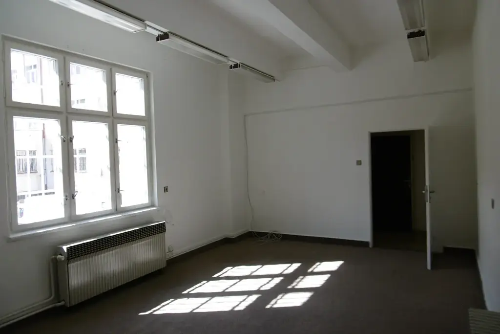 Kancelář, ateliér, sklad, studio, provozovna - nebytový prostor 27m2 s velkým oknem a vysokým stropem (3-3,5m), v pěší dostupnosti od metra. Vstup přes dvůr.