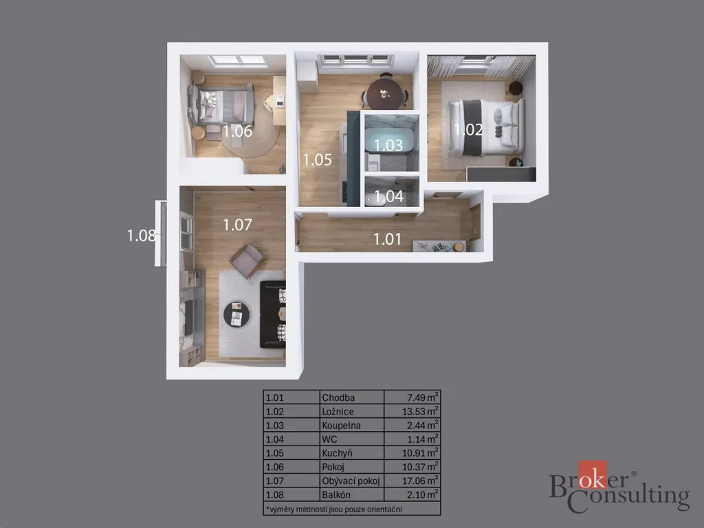 • Dispozice: chodba, obývací pokoj, ložnice, pokoj s balkonem místnost s kuchyní,
