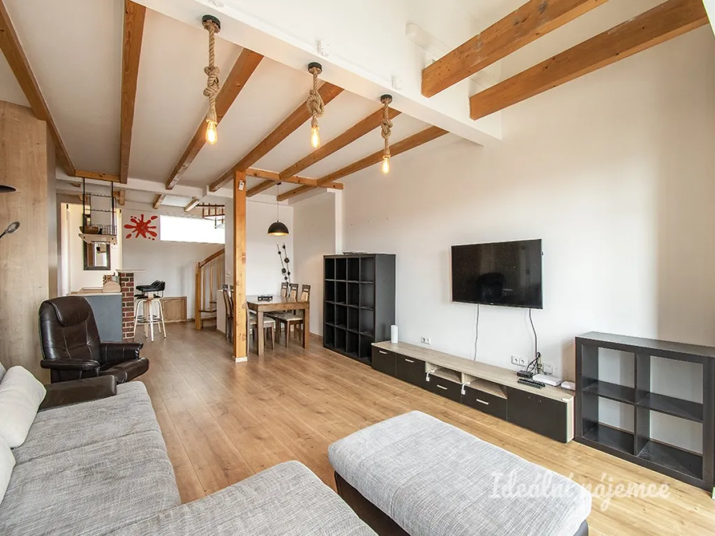 Byt se nabízí plně vybavený. Na chodbě je velká vestavěná skříň. Ve spodním patře se nachází kuchyň s obývací částí a ve vrchním patře 2 ložnice s koupelnami. Kuchyně disponuje elektrickou troubou, myčkou, lednicí, mikrovlnnou troubou, indukční deskou s digestoří a rychlovarnou konvicí. V obývací části pokoje můžeme nalézt obývací stěnu s televizí, rozkládací gauč, jídelní stůl se šesti židlemi a vstup na terasu.