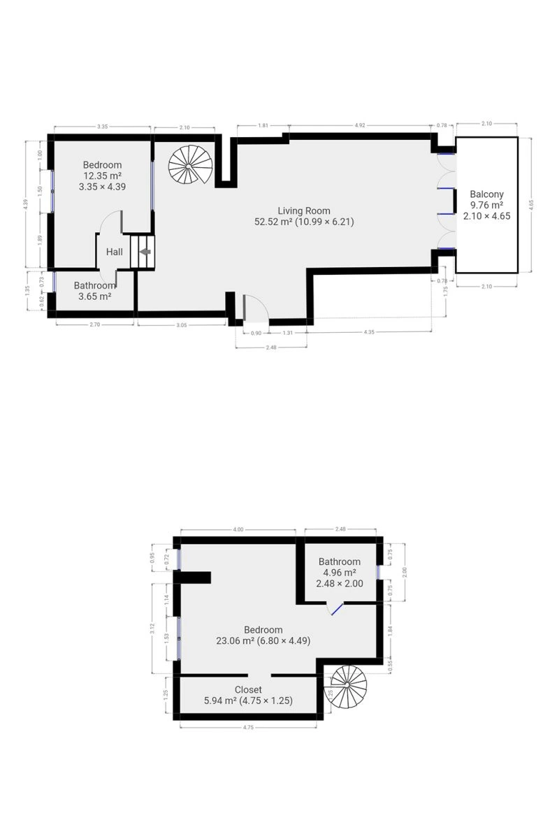 Naproti kuchyni jsou schody, které vedou do druhého patra. Pod a za schody jsou úložné prostory. Vedle kuchyně můžeme nalézt vstup do mezipatra, kde se nachází dětský pokoj a koupelna s toaletou. V druhém patře se nachází pracovní stůl s židlí, druhá koupelna s pračkou a ložnicí. Součástí ložnice je i knihovna a prostorná šatna. Po celém bytě jsou dřevěné a laminátové podlahy a klimatizace. Na oknech jsou elektrické rolety.