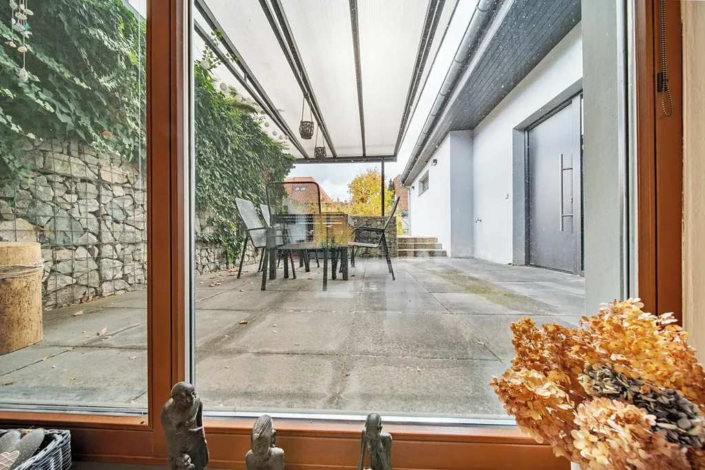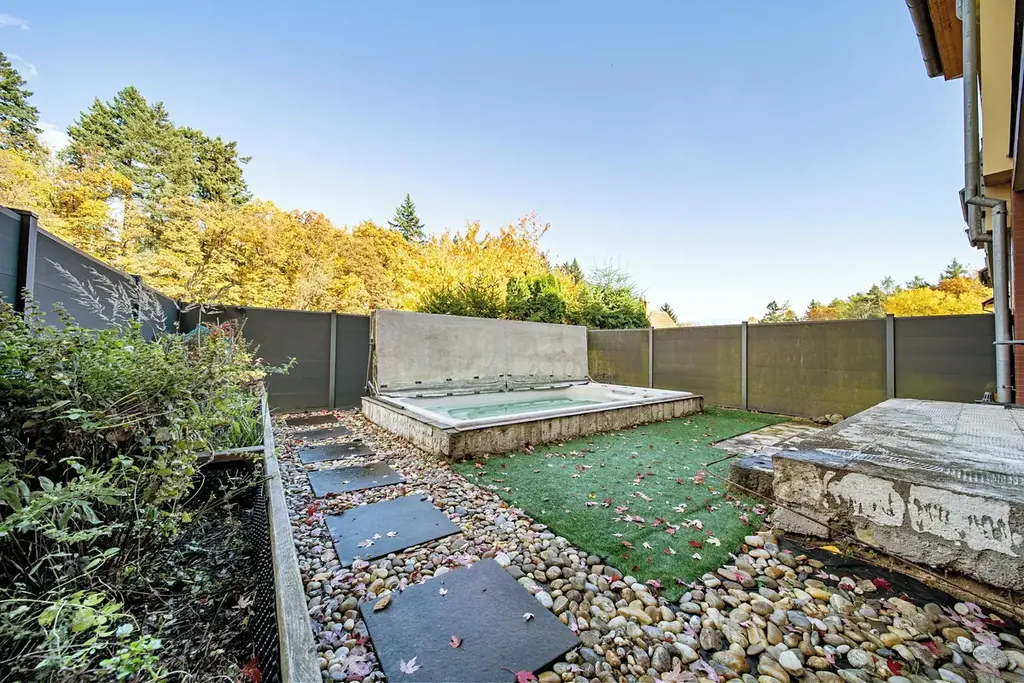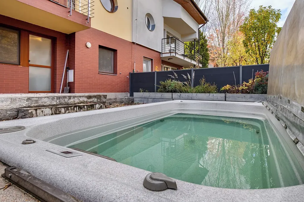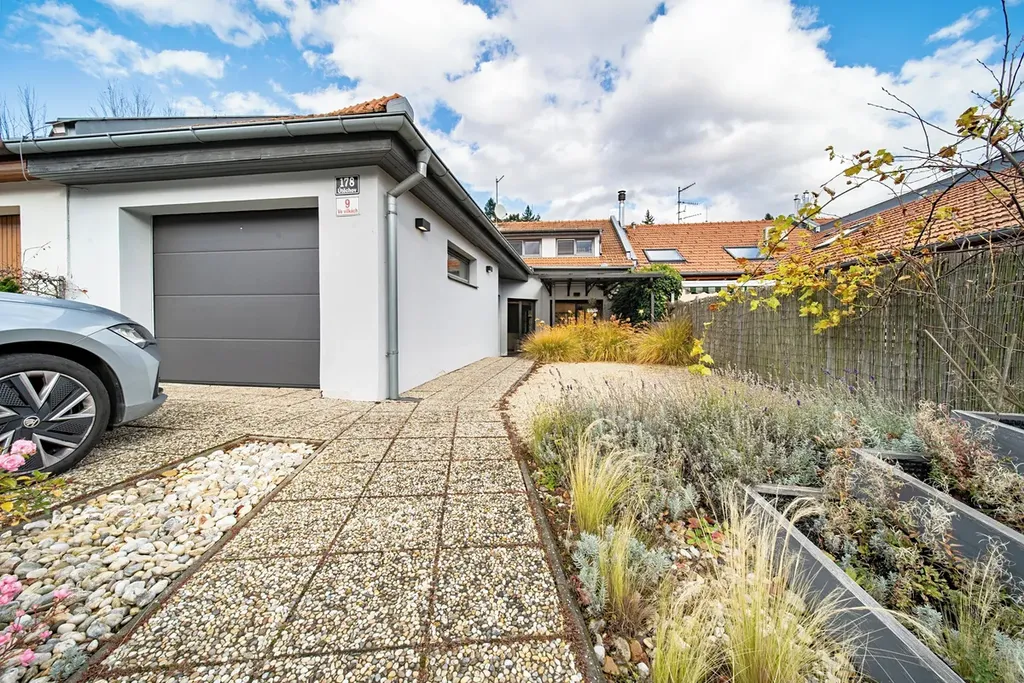 Za domem je menší zahrádka, kde je umístěný celoroční bazén s protiproudem. Před domem se nachází garáž 19,2 m2 s novými garážovými vraty na elektrický pohon, před garáží je další parkovací místo za bránou na elektrický pohon a vedle garáže je prostor, kde může být další parkovací místo, dále je možno parkovat i před domem. Nad garáží je půda 14,5 m2, využitá nyní jako skladový prostor, eventuelně zde lze vybudovat další obytnou místnost. Celková podlahová plocha domu je 230 m2, celková plocha pozemku je 297 m2, z toho zastavěná plocha je cca 150 m2, zahrádka cca 43 m2 a prostor před domem cca 104 m2. Dům je vytápěn ústředním topením s kombinovaným plynovým kotlem, v kuchyni a koupelně je podlahové topení, dům má nové vstupní hliníkové dveře, v kuchyni je kuchyňská linka Koryna z masivního dřeva. Dům se prodává včetně nábytku a všech spotřebičů (pračka a sušička značky Miele), kuchyňské spotřebiče jsou také značky Miele (trouba, myčka). Dům je v blízkém dosahu MHD (autobus).