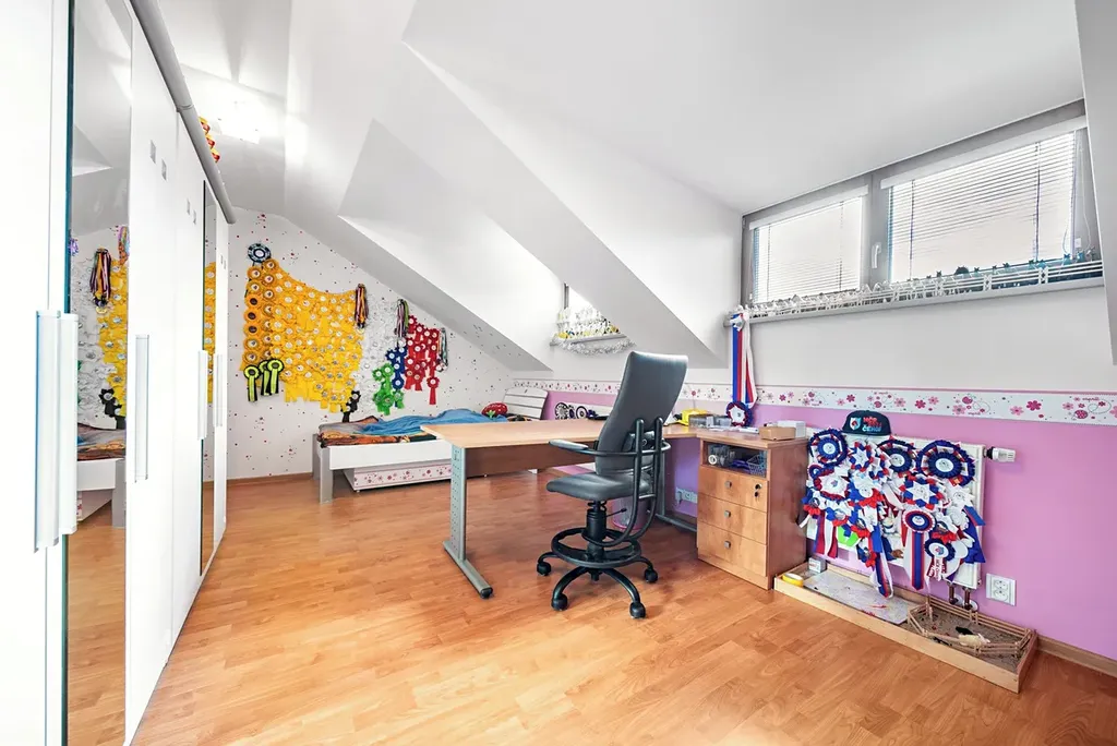 V horním patře se najdeme pokoj 23,7 m2, pokoj 22,4 m2, WC s koupelnou s rohovou vanou 8,2 m2.