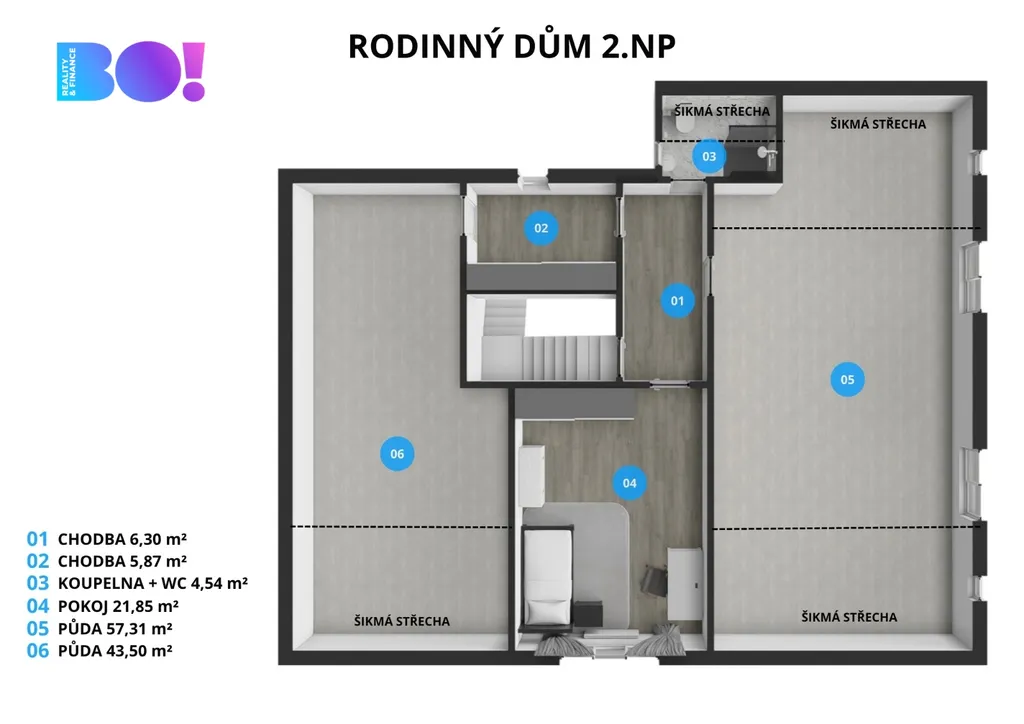 V podkroví jeden pokoj, koupelna s WC a dva půdní prostory.