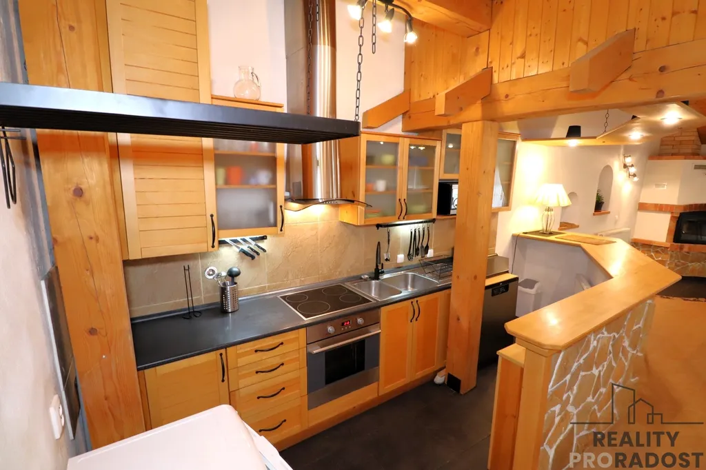 - Kompletní vybavení: Interiér je plně zařízen. K dispozici je kuchyňská linka s nádobím, troubou, sporákem, lednicí, myčkou i pračkou.