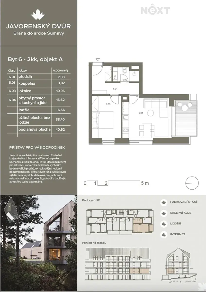 Nabízíme apartmán 2+kk o celkové ploše 38 m² s lodžií 5,96 m² a krásným výhledem do přírody. Součástí ceny je sklepní kóje (2,2 m²) a venkovní parkovací stání.