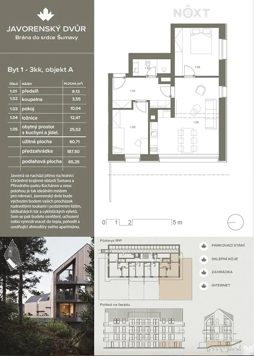 Nabízíme apartmán o dispozici 3+kk a celkové ploše 65 m². K apartmánu náleží terasa a soukromá zahrada o velikosti 246m² s krásným výhledem do okolní přírody.