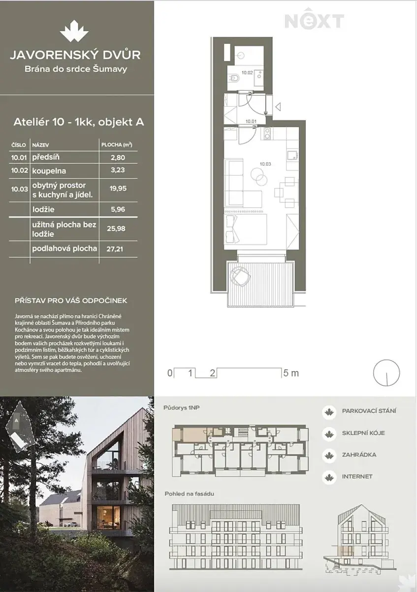 Nabízíme apartmán 1+kk o celkové ploše 27 m² s lodžií 5,96 m² a krásným výhledem do přírody. Součástí ceny je sklepní kóje (2,2 m²) a venkovní parkovací stání.