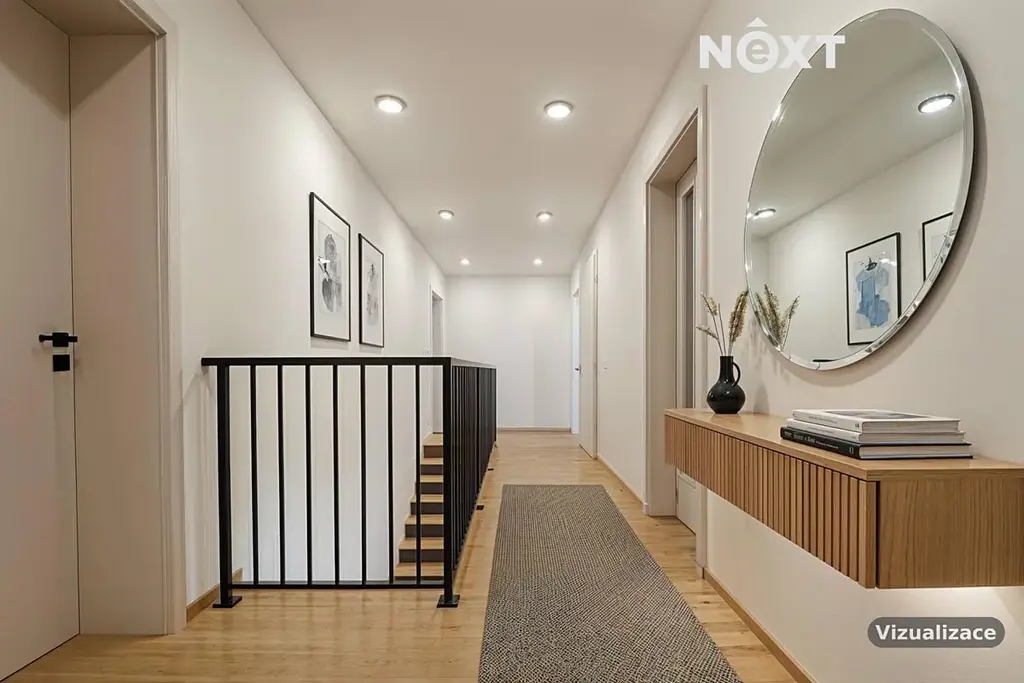 Ve 2. nadzemním podlaží potěší nadstandardní výška interiérových dveří 210 cm se zvýšenými obložkami, které podtrhují celkový moderní vzhled interiéru. Kvalitu stavby dále potvrzují izolační trojskla oken a hliníkové provedení všech vstupních dveří a HS portálu.