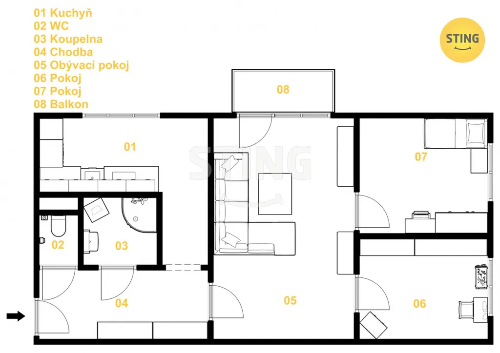 Byt o podlahové ploše 65 m2 se nachází ve 2. patře bytového domu bez výtahu.