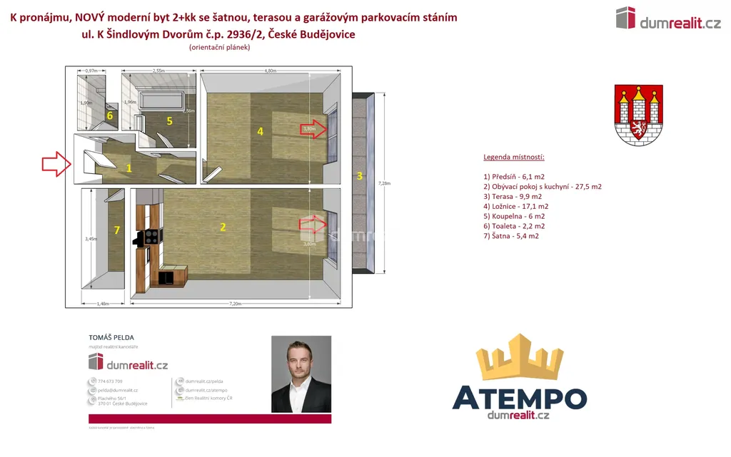 Dumrealit.cz Vám zprostředkuje pronájem NOVÉHO moderního bytu 2+kk ve vysokém standardu s vysokými stropy, šatnou, samostatnou toaletou, terasou a krytým garážovým stáním v novostavbě bytového domu v nové ulici K Šindlovým Dvorům č.p. 2936/2 na okraji města České Budějovice. Bytová jednotka se nachází ve 4. patře a je situována na západní světovou stranu. Okna bytu jsou vybavena venkovními předokenními žaluziemi. V bytě je nová kuchyňská linka s vestavěnými spotřebiči. V obytných místnostech jsou velké prosklené dveře, přes které se dostaneme na prostornou terasu. Podrobné rozkreslení dispozice naleznete na orientačním plánku mezi fotografiemi. Nájemné bytu činí 19.000,-Kč měsíčně + elektřina a internet + poplatky ve výši 3.800,-Kč pro 2 osoby + kryté garážové stání za 1.500,-Kč. K dispozici ihned. Hledáme dlouhodobé a solidní nájemníky. V docházkové vzdálenosti se nachází veškerá občanská vybavenost (nákupní centrum, vysoké školy apod.). Více informací Vám poskytne realitní makléř Tomáš Pelda z realitní kanceláře A TEMPO fungující pod ochrannou známkou dumrealit.cz. Ev. číslo: 655334.