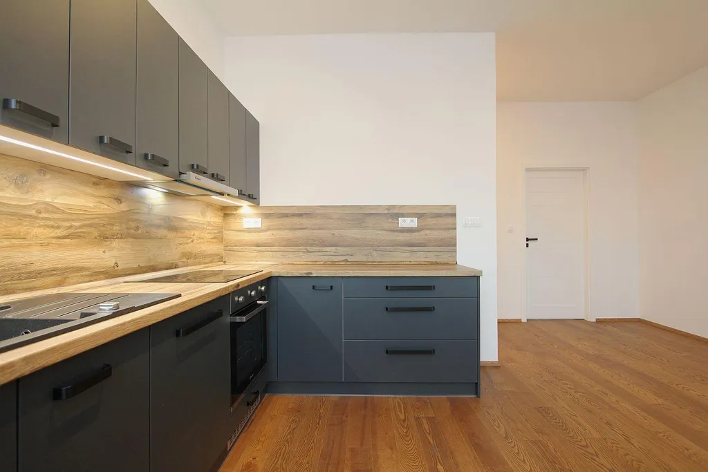 Byt se pronajímá včetně vybavené kuchyňské linky s potřebnými spotřebiči (varné desky, trouby, odsavače par, myčky nádobí, ledničky, pračky se sušičkou).