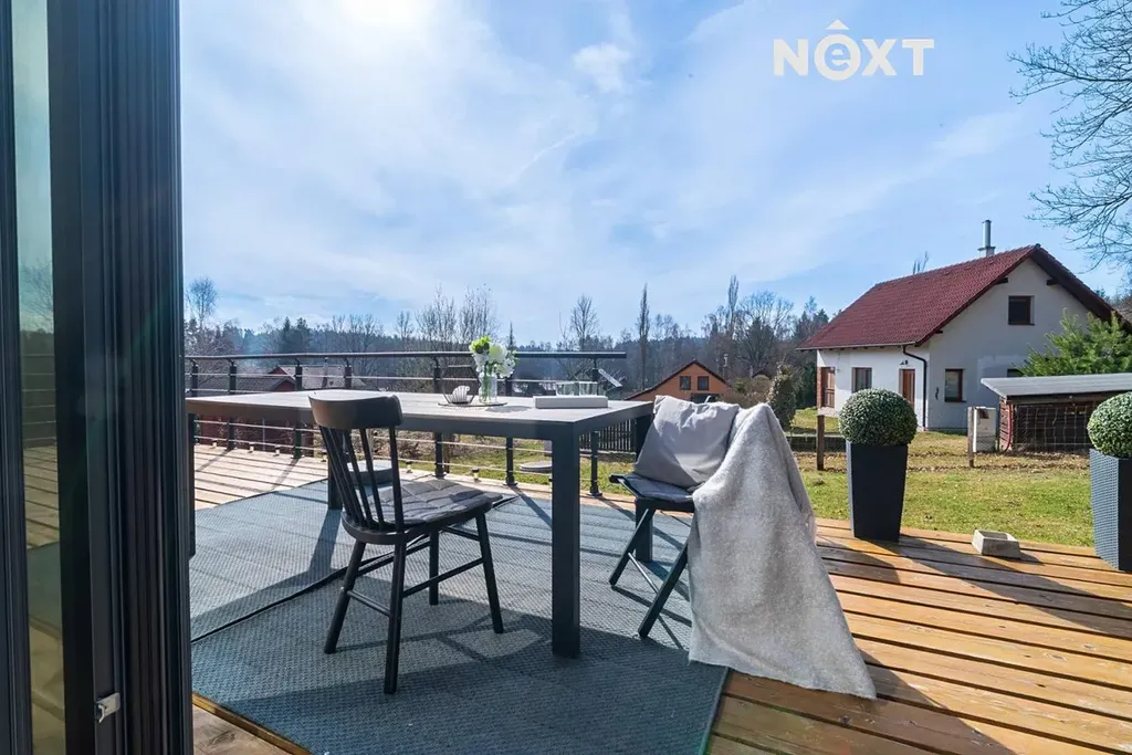 Z obývacího pokoje je přímý vstup na prostornou terasu o velikosti 25 m², která nabízí ideální místo pro ranní kávu, letní posezení s přáteli nebo grilování. Chata je orientovaná na jih, což zajišťuje dostatek přirozeného světla po celý den.