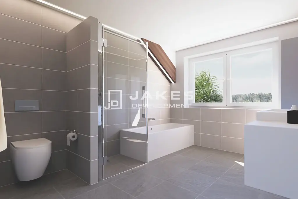 Dřevěné podlahy s podlahovým vytápěním – pro maximální komfort a příjemnou atmosféru domova. Koupelna s velkoformátovou dlažbou a moderními sprchovými podomítkovými bateriemi. Venkovní žaluzie – snadná regulace světla i soukromí. HS portál s trojsklem – zajišťuje špičkovou tepelnou izolaci a odhlučnění. Energetická náročnost budovy třídy B – nízké provozní náklady.
