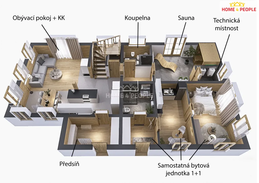 Jeden vstup je do menší bytové jednotky s kuchyní ,pokojem a koupelnou s WC.