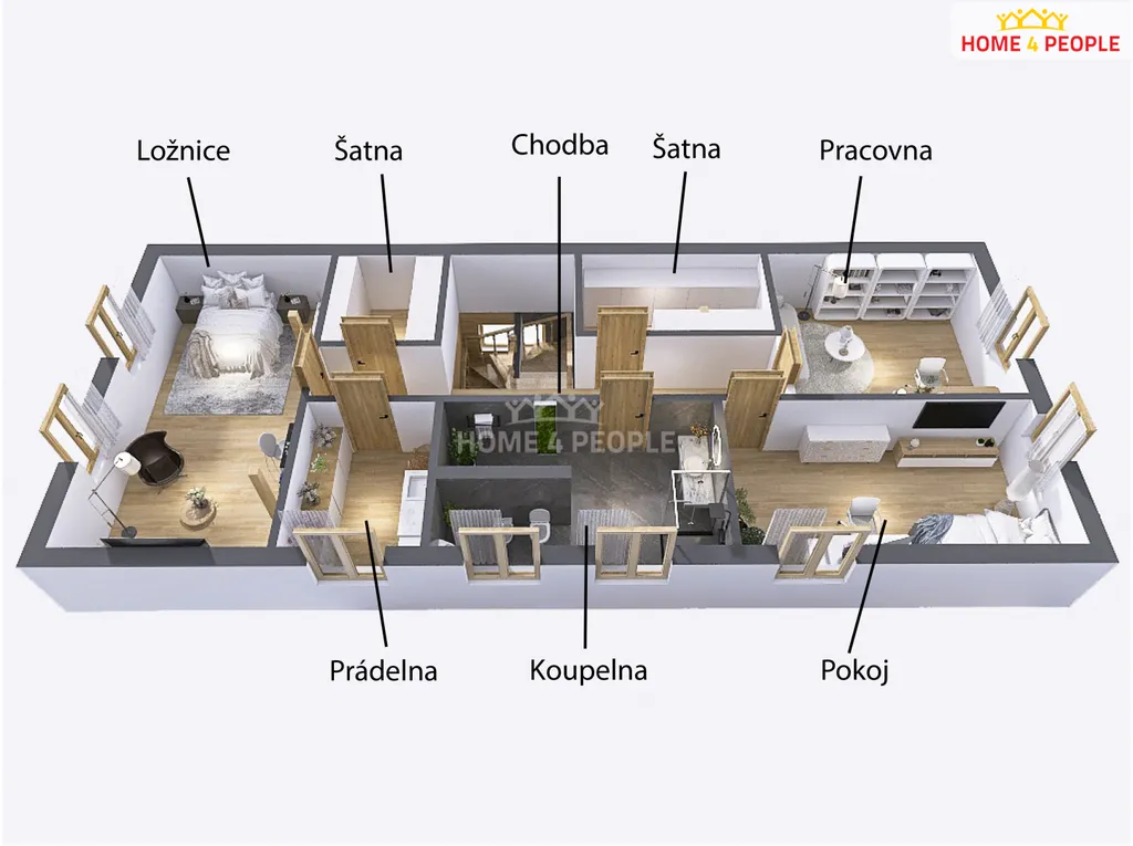 V podkroví je velkorysá ložnice, pokoj pro hosty , útulná pracovna, dvě samostatné šatny, koupelna s WC a neodmyslitelná prádelna.
