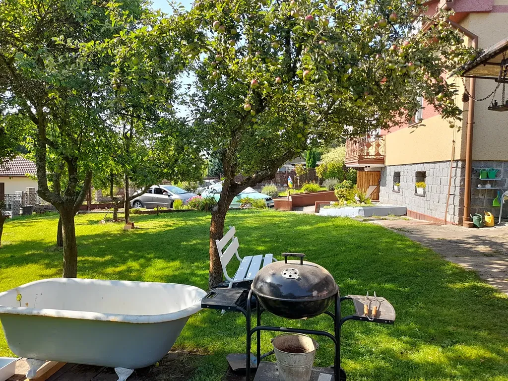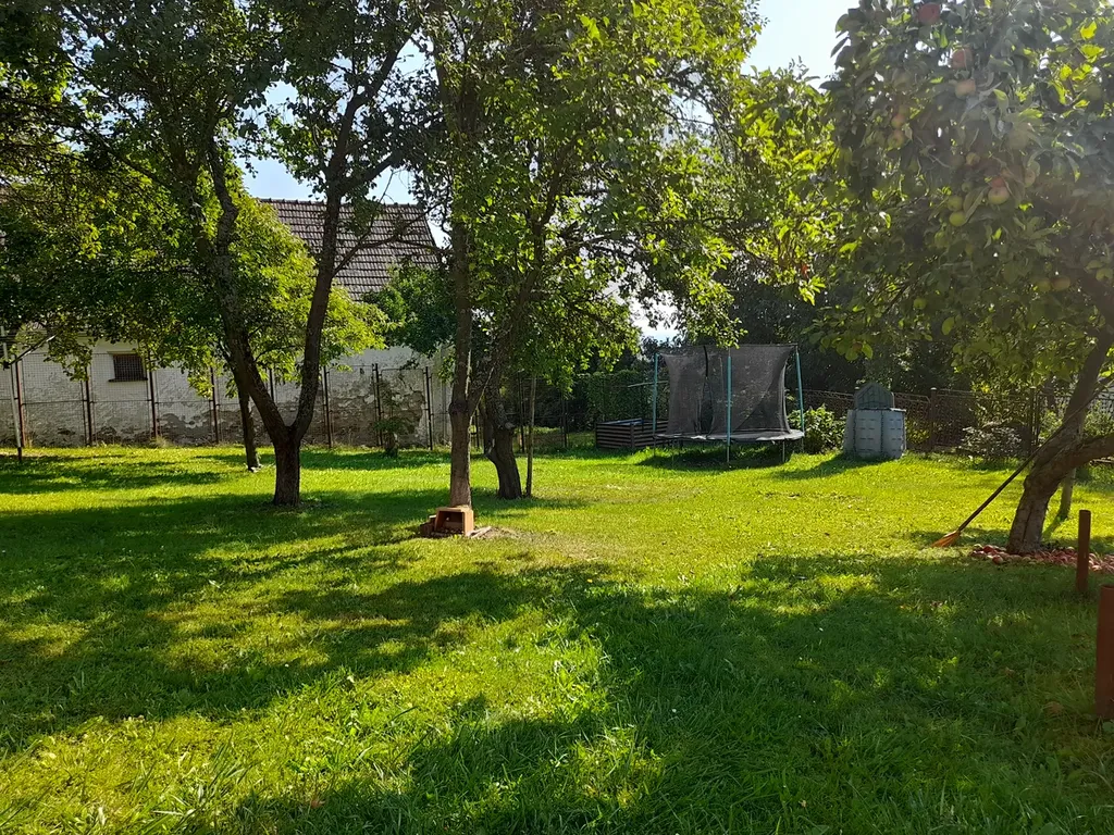 Rodinný dům stojí v oplocené zahradě s ovocnými stromy, 2x venkovní sezení, garáž v suterénu domu a parkování na vlastním pozemku.