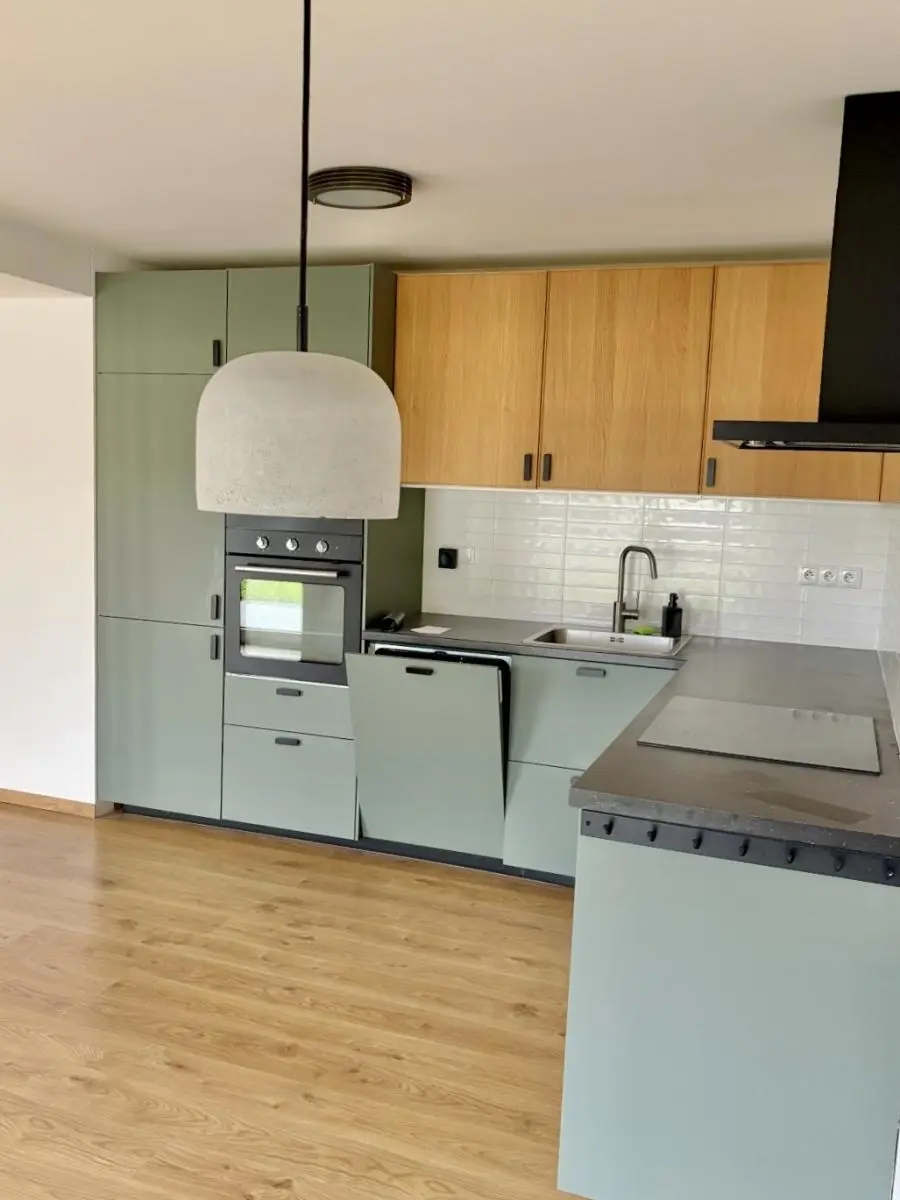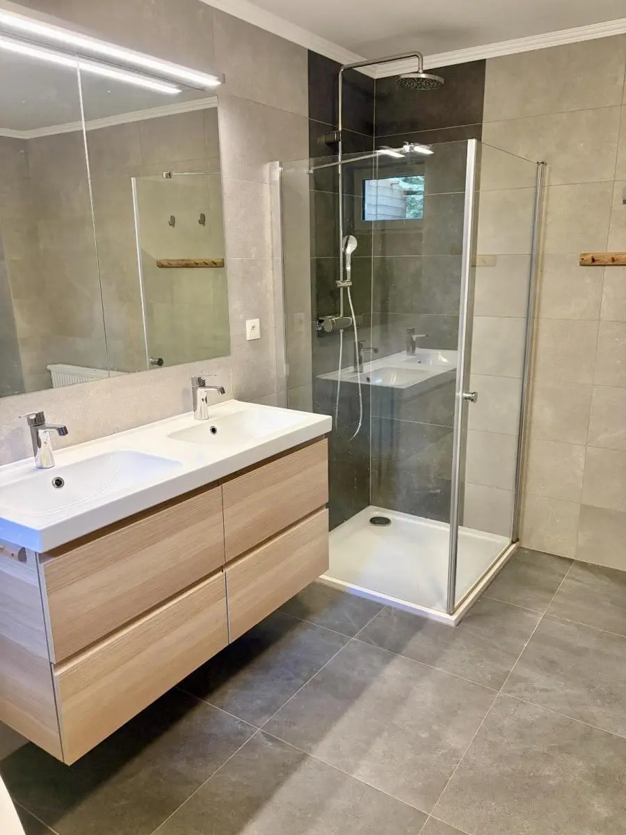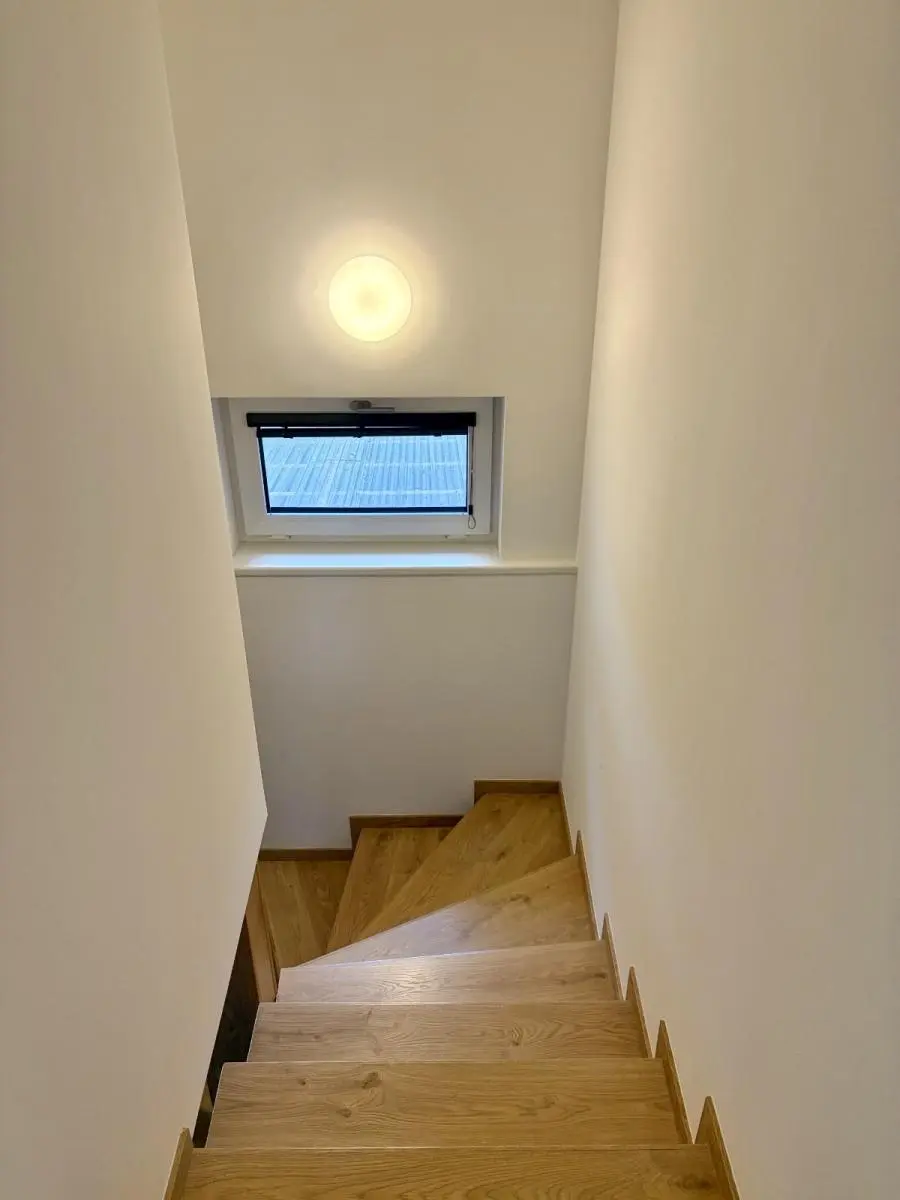 Na podlahách je kombinace plovoucí podlahy a dlažby. V přízemí je podlahové vytápění, v patře radiátory.