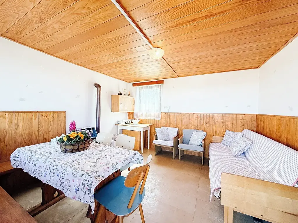 Obytnou část tvoří jedna místnost s kamny, která vás v chladných dnech příjemně zahřejí, nebo na nich můžete i něco uvařit. Po žebříku se z místnosti dostanete na nízkou půdu s okénkem. Zde je možné udělat spaní.