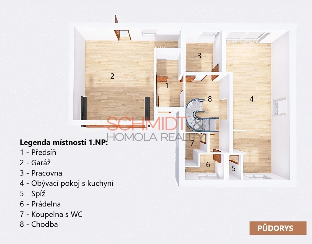 Přízemí domu nabízí garáž pro dvě auta, průchozí dále do zahrady, případně do vstupní chodby. Z té dále pokračujeme do středové haly, která od sebe dělí pracovnu, obývací pokoj s jídelnou a kuchyňským koutem, koupelnu se sprchovým koutem + WC a prádelnu. Užitná plocha prvního podlaží činí 115,64 m², obytná plocha bez garáže potom 78,04 m².