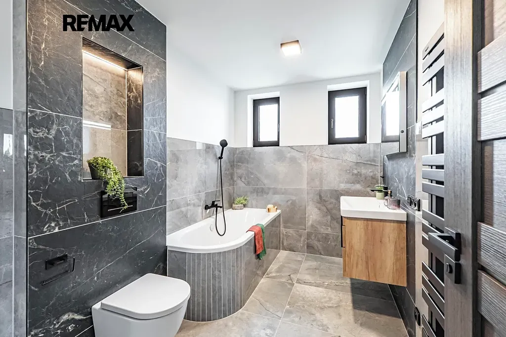 V patře se nachází další ložnice s balkonem, koupelna s vanou, praktický kumbál a tři další místností. V jedné z nich je navíc příprava na druhou kuchyni – ideální pro dvougenerační bydlení nebo při rozdělení domu na dvě bytové jednotky.