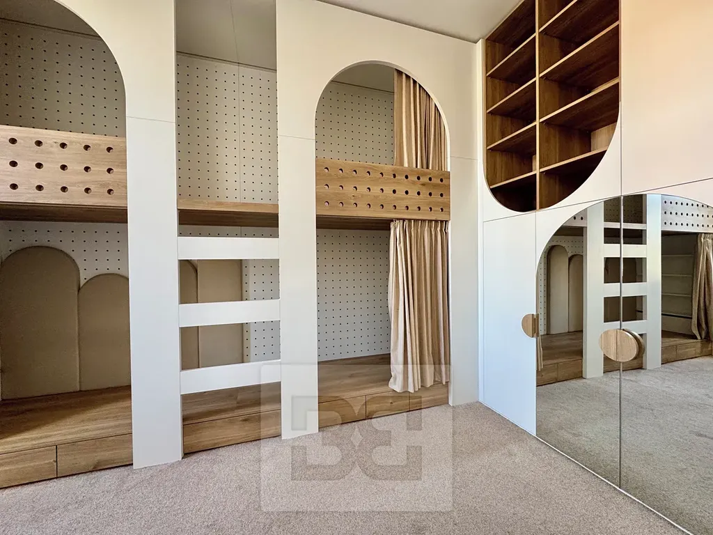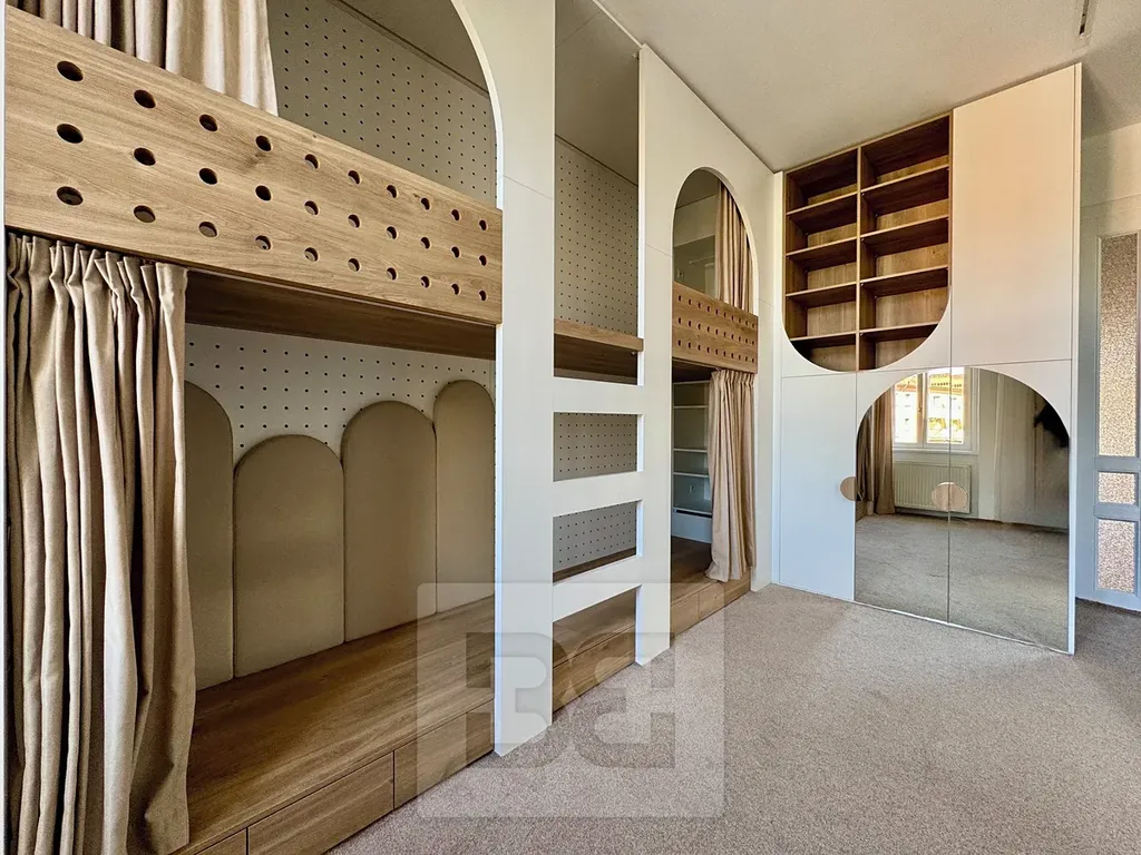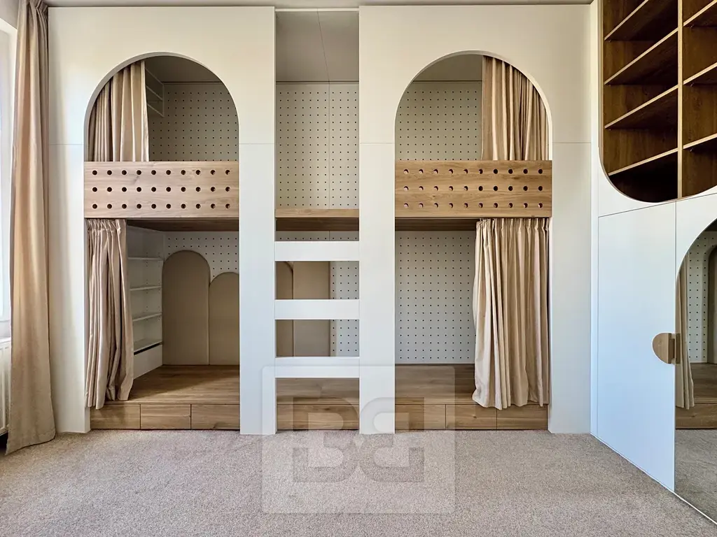 Obývací pokoj je zařízen nábytkem dle fotografií a nabízí komfortní prostor pro odpočinek. Dále byt disponuje ložnicí s vybavením a dětským pokojem s nábytkem na míru.