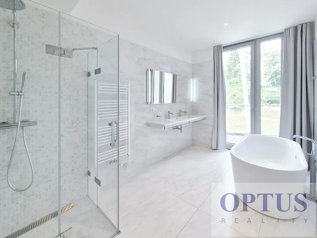 Nabízíme k pronájmu luxusní nezařízený mezonetový byt 5 + kuchyňský kout (211,70 m2) + 2 terasy celkem cca 80 m2 a střešní zahrada cca 31 m2, situovaný v 5. a 6. patře novostavby bytového domu s recepcí, ostrahou, rozlehlou terasovitou zahradou a s podzemním parkováním.