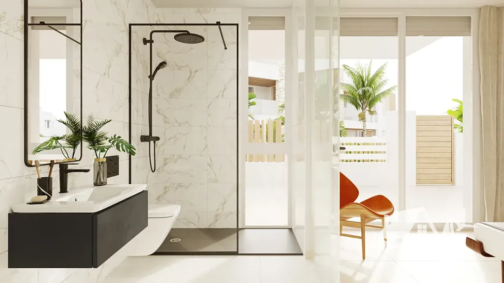 Interiéry jsou vyvedené v prvotřídním standardu, porcelánová dlažba dodává eleganci a dlouhodobou odolnost, elektrické rolety a videotelefon zvyšují pohodlí a bezpečnost a vestavěné skříně udržují domov přehledný a organizovaný. Rezidenční komplex doplňují pečlivě řešené společné prostory s rozlehlými zahradními plochami a sdíleným bazénem, které rozšiřují možnosti volnočasového vyžití a rodinné pohody.