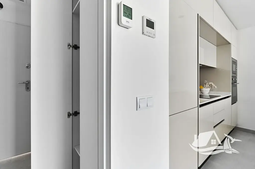 Interiér je navržen s důrazem na moderní standard a funkčnost. Součástí vybavení jsou vestavěné skříně, plně vybavená kuchyň se spotřebiči, klimatizace, alarm a kvalitní podlahy. Podlahové vytápění v koupelnách zajišťuje vyšší komfort a celkové řešení interiéru působí prakticky i nadčasově.