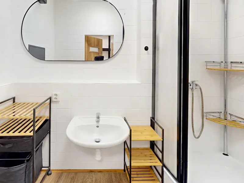Koupelna je vybavena sprchovým koutem. Velkým benefitem je samostatná šatna / komora, která poskytuje dostatek úložného prostoru.