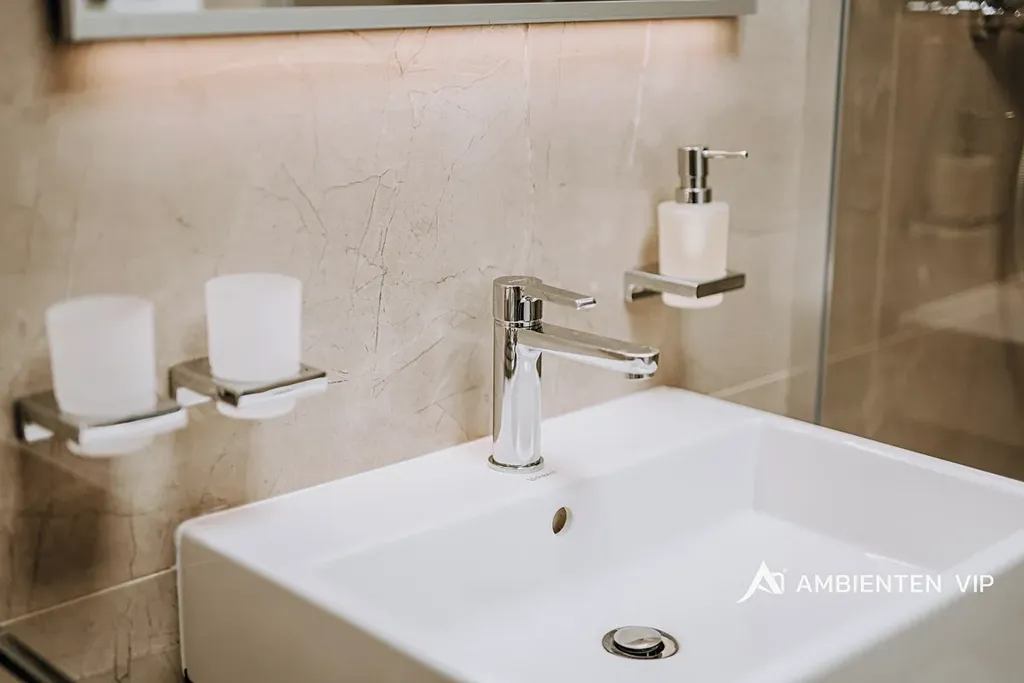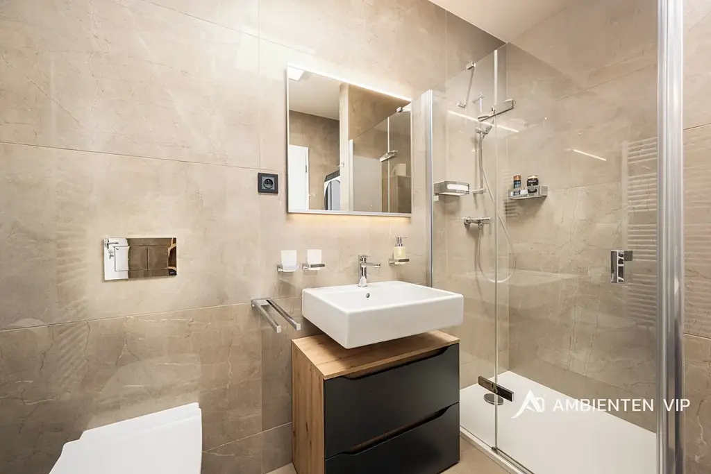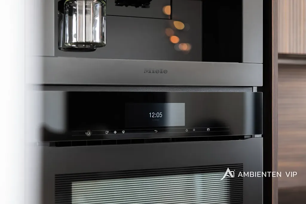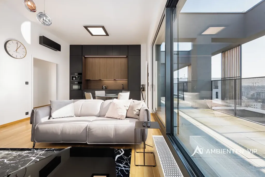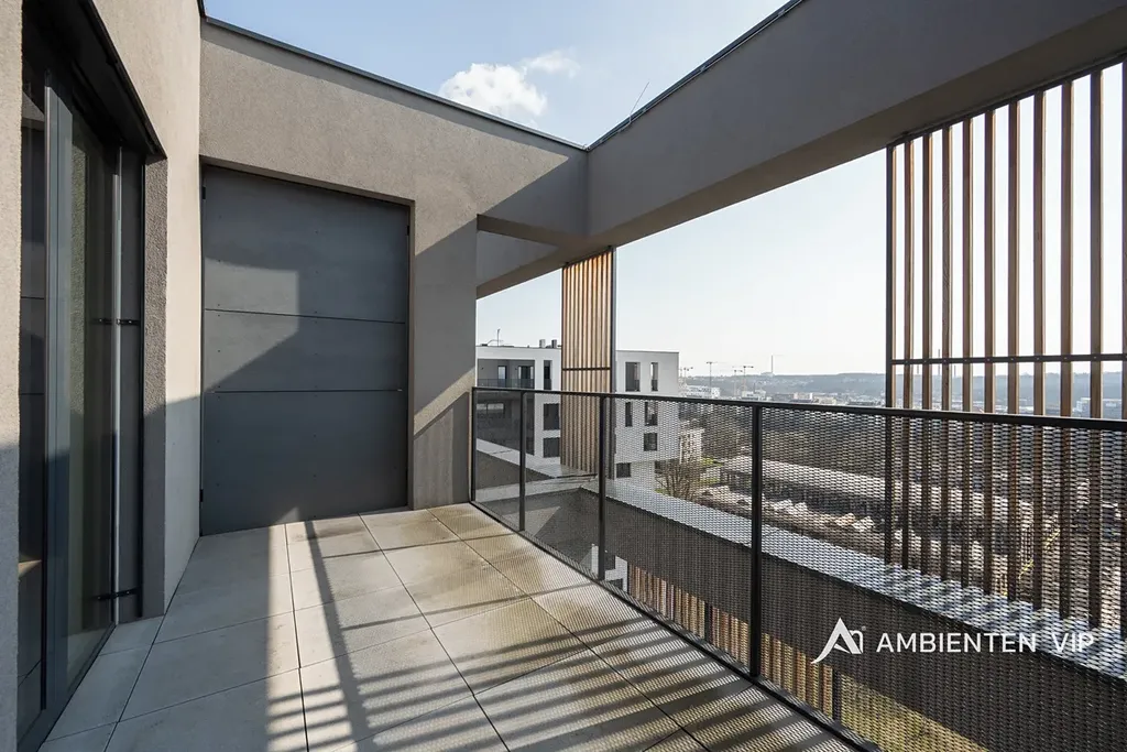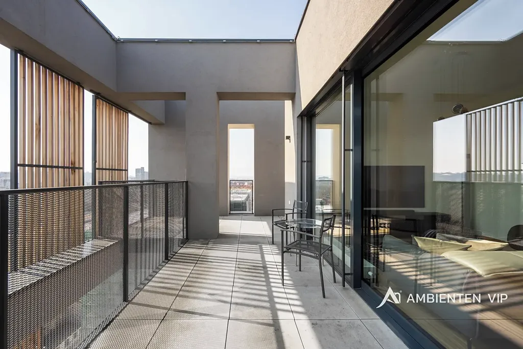 Ambienten vip si vám dovoluje exkluzivně nabídnout novostavbu plně klimatizovaného luxusního bytu 2+kk o výměře 71,8 m2 s prostornou terasou kolem celého bytu nabízející krásné výhledy na Prahu v posledním 11. NP bytového domu. Nemovitost je provedena v luxusním stylu s nákladně a precizně provedenými interiéry na míru. Kuchyňská linka je od firmy Sýkora vč. vestavných spotřebičů Miele vše v záruce. Je vybavena indukcí, kombinovanou troubou s mikrovlnou troubou nejvyšší řady Miele, myčkou Miele, lednicí s mrazákem od značky Liebherr. Kuchyně je vyrobena v laku s pracovní deskou do firmy Dekstone. Sedací souprava je od firmy Natuzzi. Osvětlení v celém bytě je na zakázku a lustr v obývacím pokoji je v hodnotě 130 tis. Kč. Okna jsou hliníková trojskla vč. venkovních žaluzií na dálkové ovládání. Interiérové dveře v bytové jednotce jsou v bílém matu. Podlahy v celém bytě jsou masivní dřevěné dubové. Vytápění v domě je řešeno přes centrální kotelnu. V bytě jsou osazeny radiátory. Součástí prodeje je i jídelní stůl od firmy Hulsta, 4 x jídelní židle, kožené křeslo v obývacím pokoji, dále televize LG – nejvyšší řada, postel v ložnici dvojlůžko 2 m x 1,8 m s matrací. Koupelna má vstup z chodby i přímo z ložnice. Nachází se v ní toaleta, umyvadlo, sprchový kout, pračka, sušička zn. Miele nejvyšší řady. Klimatizace jsou od firmy Daikin, lze s nimi i přitápět. Sklepní kóje je umístěna v -1 podlaží, parkování v -2 podlaží od kterého komfortně dojdete k výtahu a dojedete přímo do bytu v 11 NP. Pokud vás tato luxusní nemovitost s možností okamžitého nastěhování zaujala neváhejte si sjednat prohlídku. Tuto nemovitost ocení především náročný klient, který má rád své soukromí, preferuje poslední patro, perfektní parkování, výbornou dostupnost 20 min do centra Prahy. Z bytu je krásný výhled i na Pražský hrad.
