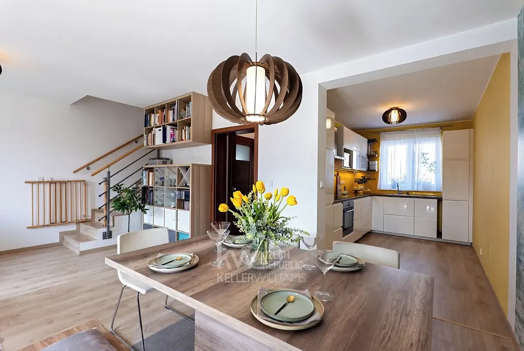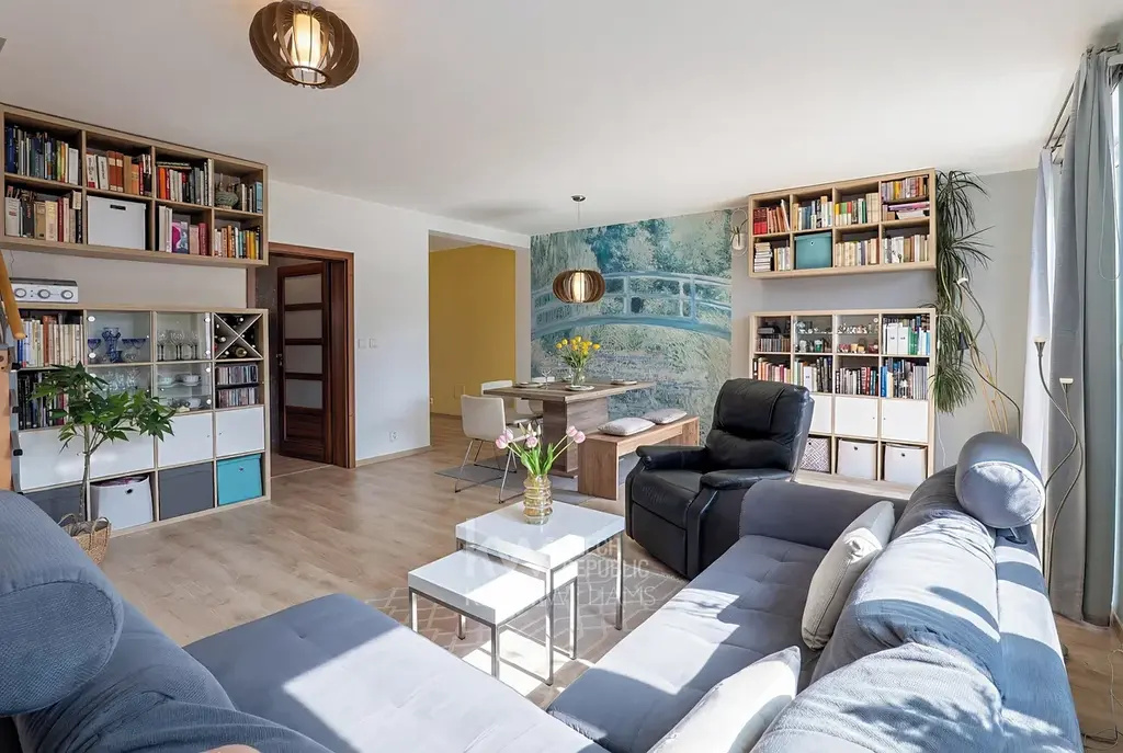 - Velký obývací pokoj s kuchyňským koutem, kam se pohodlně vejde velký gauč, jídelní stůl pro šest osob a přitom stále poskytuje dostatek prostoru.