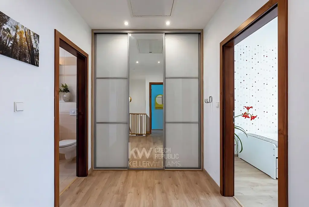 - V patře jsou umístěny 3 ložnice. Hlavní ložnice je orientovaná na sever. Vejde se sem manželská postel, skříně, ale i třeba pracovní kout pro práci z domova.