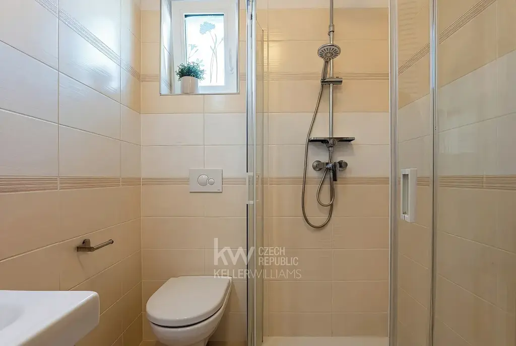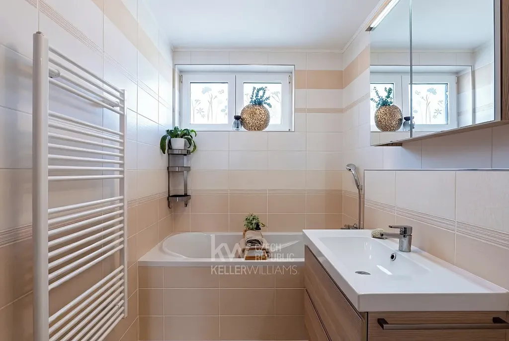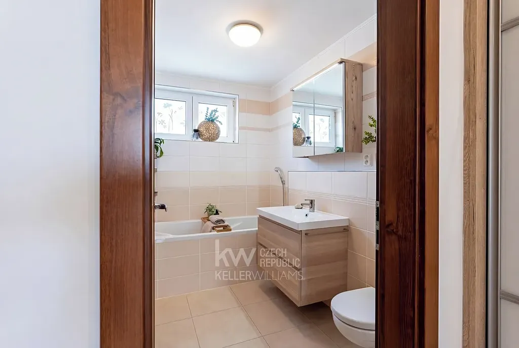 - Ve druhém podlaží je zas prostorná koupelna s vanou ideální pro večerní relaxaci a s toaletou.