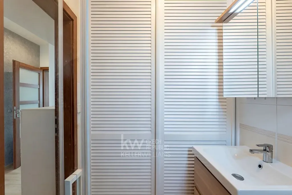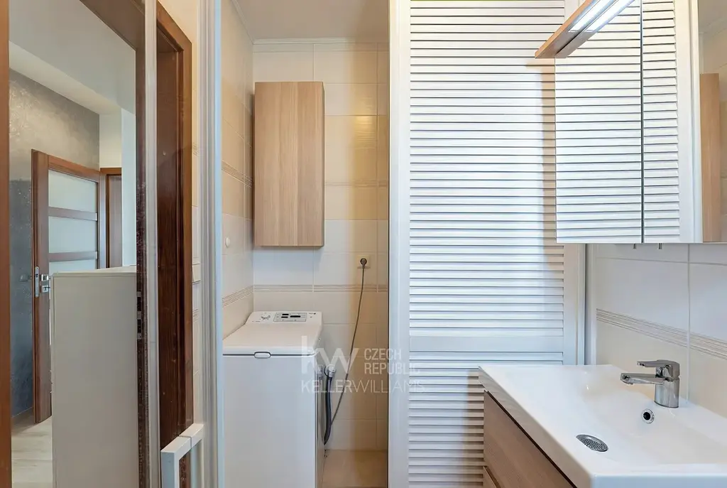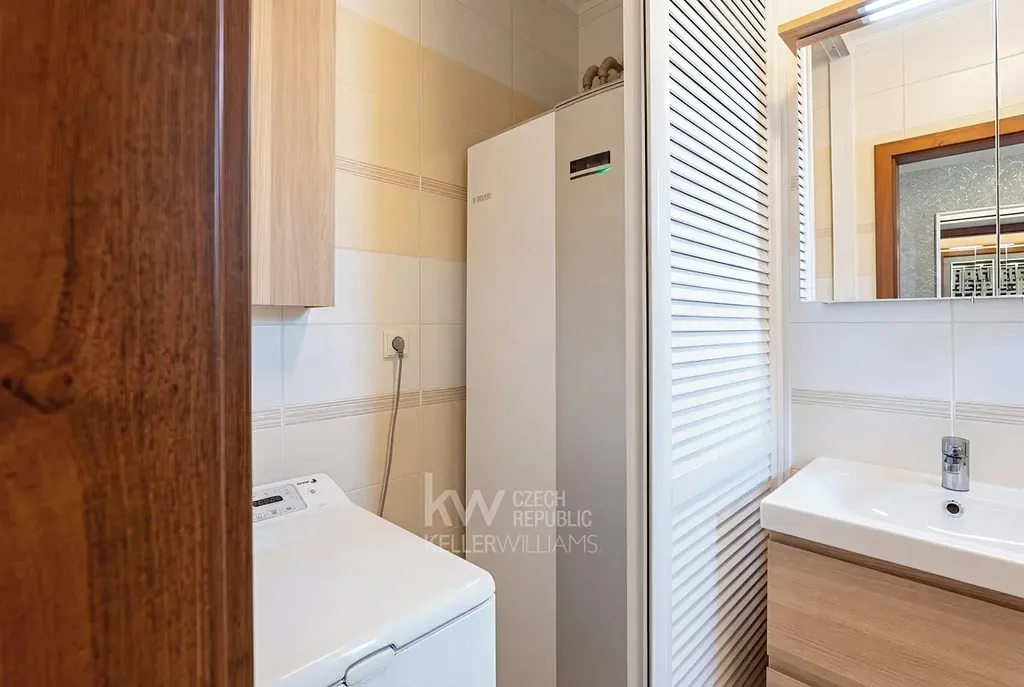 - Koupelny jsou v domě dvě. V přízemí je koupelna se sprchovým koutem a toaletou. Uvnitř této koupelny se za žaluziovými dveřmi elegantně skryje vnitřní jednotka tepelného čerpadla, pračka a sušička.