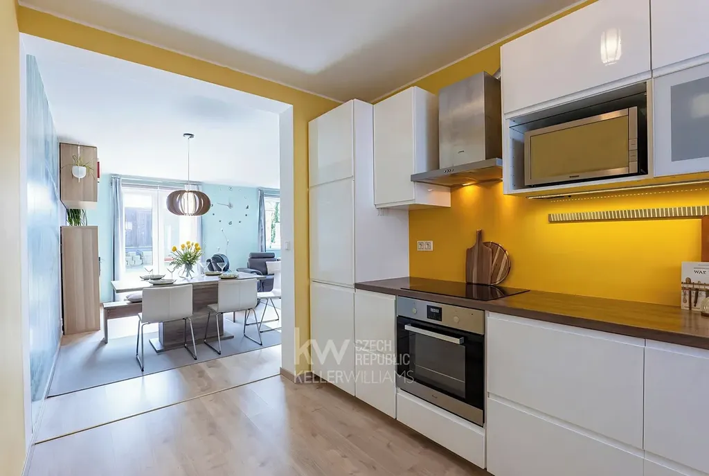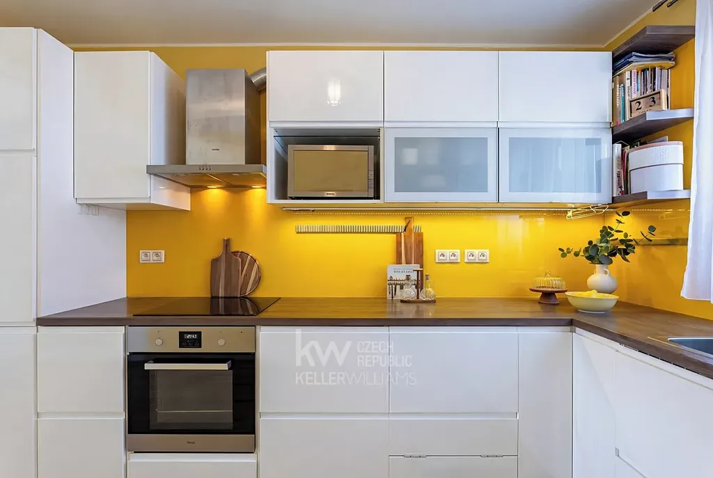 - Kuchyňský kout je vybaven všemi spotřebiči (vestavěná lednice, myčka, trouba, varná deska a aktivní digestoř) a má velkou pracovní plochu. Pracovní plochu a úložný prostor kuchyně lze v případě potřeby ještě rozšířit o další kuchyňské skříňky a další pracovní plochu, kuchyň lze také zcela oddělit nebo z ní vytvořit další samostatný pokoj.