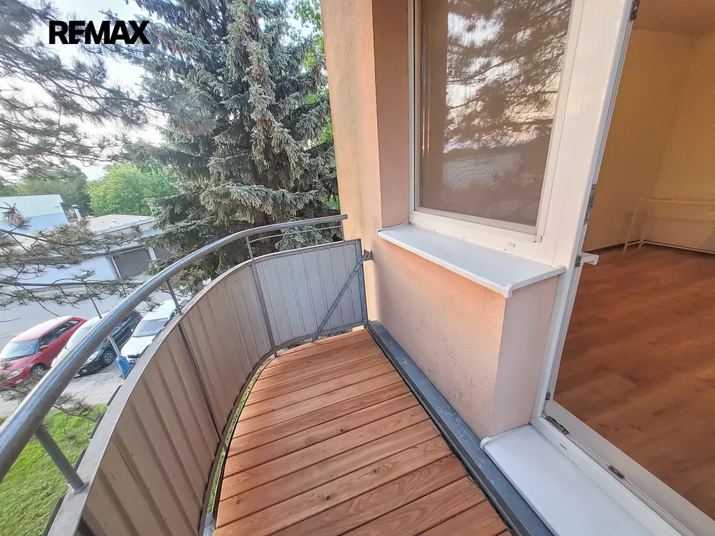 Z obývacího pokoje vedou dveře na balkón orientovaný do zeleně.
