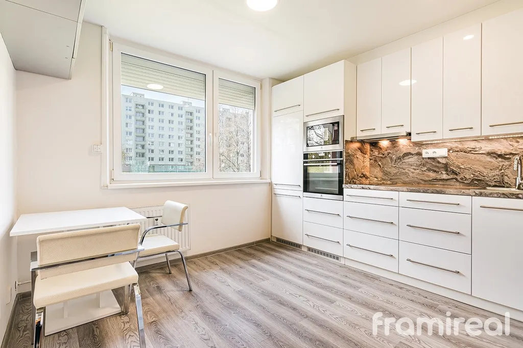 Interiér bytu je vybaven moderní kuchyňskou linkou se spotřebiči, prostornou vestavěnou šatní skříní a dalšími praktickými prvky. K bytu náleží také sklepní kóje, která nabízí dostatek úložného prostoru.
