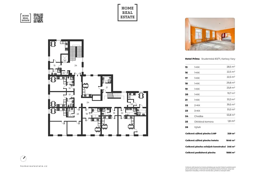 • 19x apartmánů 1+kk o užitné ploše od 25 m² do 33 m²