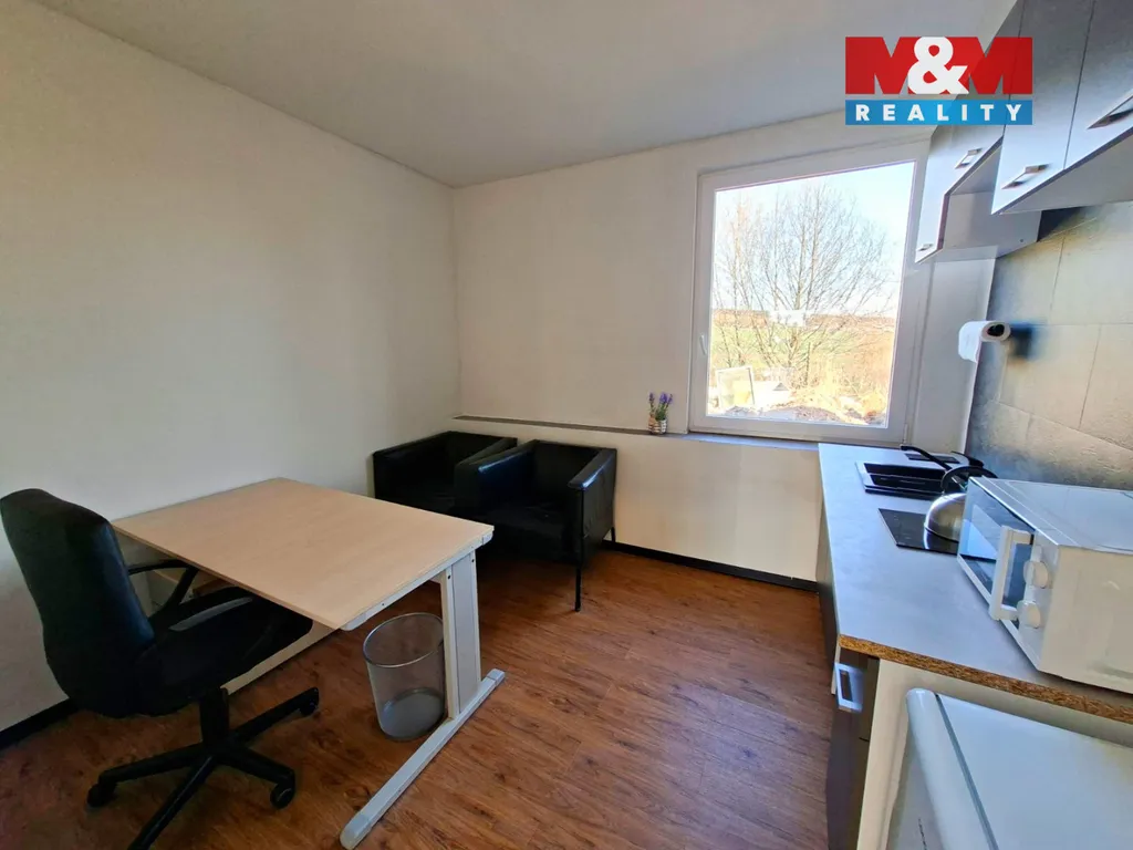 * Kancelář na klíč s kuchyňským koutkem: Kompletně vybavená nábytkem (pracovní stůl, manažerské křeslo, posezení pro klienty). Moderní linka v šedém dekoru, indukční deska, lednice, mikrovlnná trouba, nerezové doplňky.
