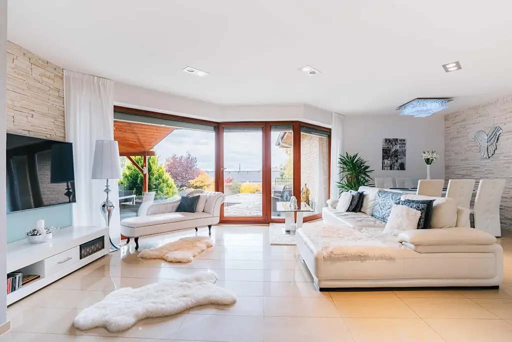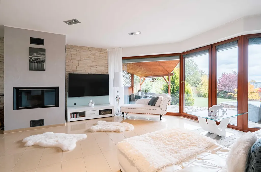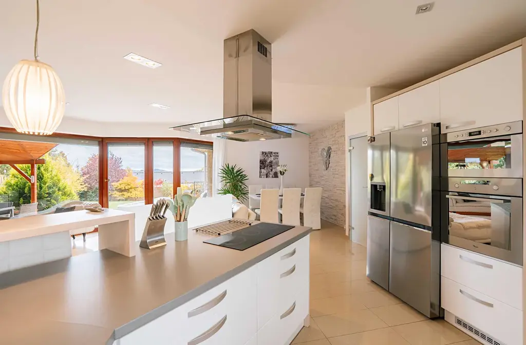 Dominantou domu je prostorný obývací pokoj s kuchyní a krbem o výměře 50 m². Díky velkým francouzským oknům je celý dům dokonale prosvětlený a propojený se zahradou.
