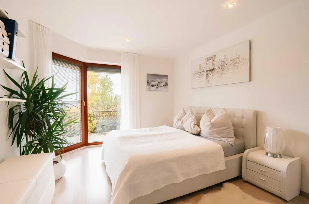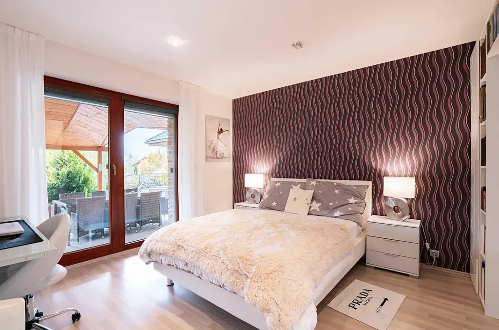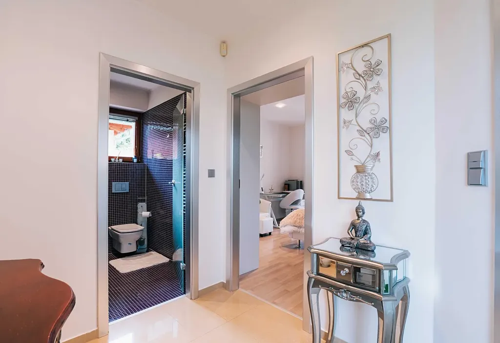 Vedlejší křídlo disponuje samostatnou ložnicí s vlastní koupelnou – ideální řešení pro hosty, dospívající děti nebo pracovnu s odděleným vstupem.