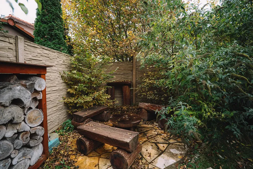 Zahrada je opravdovou oázou klidu – díky vzrostlým stromům a betonovému plotu nabízí naprosté soukromí. Vychutnáte si tu grilování, koupání ve vířivce nebo večerní posezení u ohně.