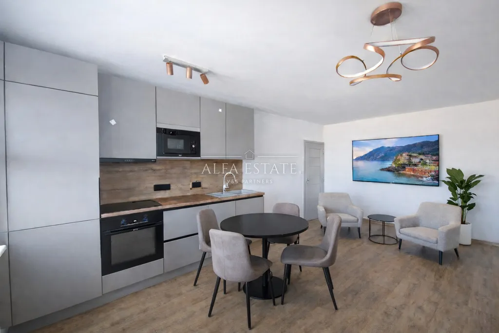 Srdcem bytu je moderní kuchyňská linka vyrobená na míru se spotřebiči značky Gorenje, která elegantně navazuje na obývací část a vytváří otevřený, vzdušný a příjemný obytný prostor. Ve stejném kvalitativním standardu byla zhotovena také prostorná vestavěná skříň v předsíni, rovněž značky Gorenje. Koupelna byla navržena s důrazem na estetiku i praktičnost a nabízí prostorný sprchový kout o velikosti 120 cm i citlivě řešený prostor pro pračku a sušičku.